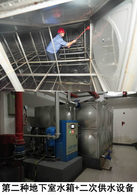 是市政自來水首先流至小區(qū)地下室泵房內(nèi)的不銹鋼水箱中,然后水箱里的水通過恒壓供水設(shè)備加壓到高層用戶家中。這種供水方式,二次供水水箱一般都在小區(qū)地下室設(shè)備房內(nèi);