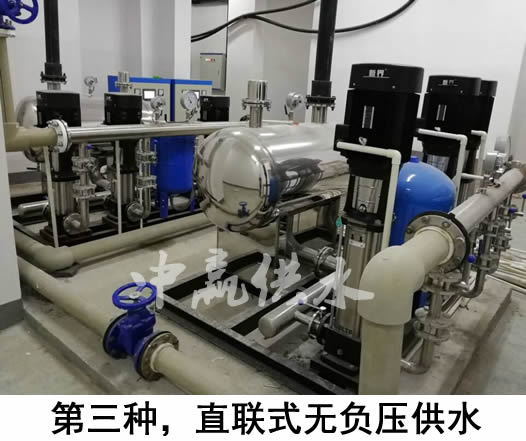 第三種:是采用無負壓的供水設(shè)備,直接從自來水管道加壓將水送至用戶家中。這種給水方式,沒有二次供水水箱,是目前為衛(wèi)生的一種給水方式。
