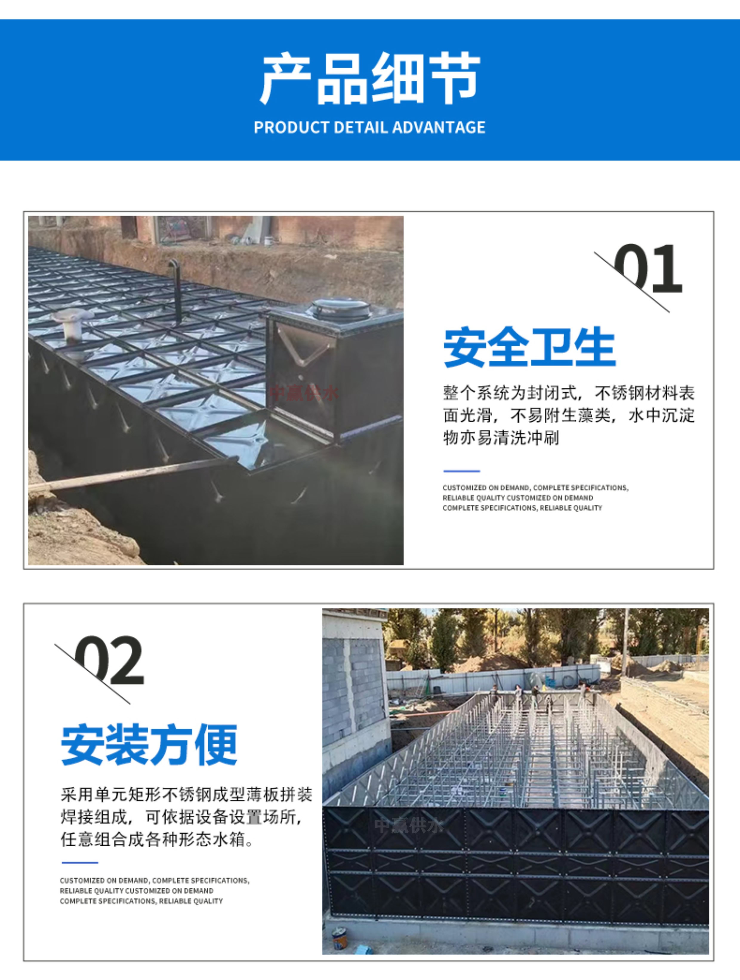 設(shè)備整體采用箱泵一體化結(jié)構(gòu),將水箱與泵房合二為一,無需單獨建造混凝土泵房,顯著減少占地面積,尤其適用于土地資源緊張的城市區(qū)域。